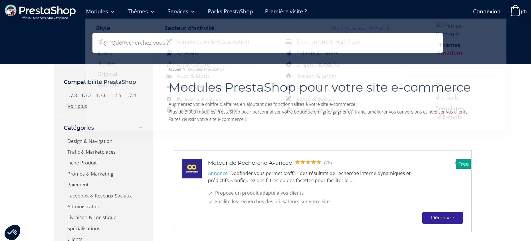 Sur le site officiel du CMS, les modules sont répartis par grandes familles : les modules SEO, les modules de comparateurs de prix, de paiement, les modules de services de livraison, de fiche produit, de réservation, etc. Au total ? Des milliers de PrestaShop Addons sont mis à votre disposition sur le site du célèbre CMS.