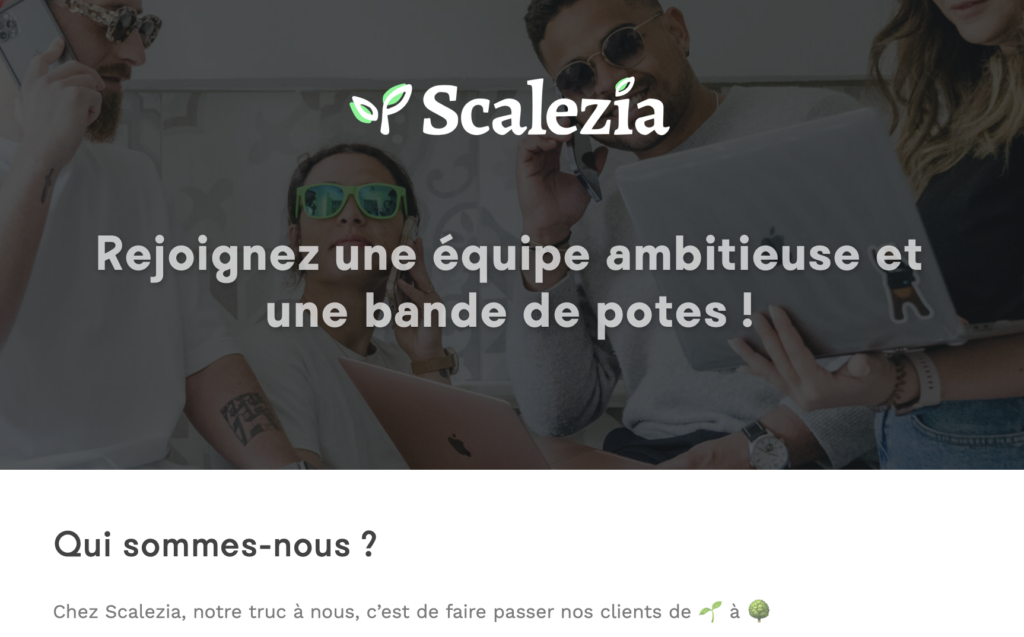 Rappelez-vous qu’un candidat se renseigne généralement en détail sur l’entreprise, avant de postuler. C’est pourquoi celle-ci doit aligner son marketing RH avec son positionnement et le reste de sa communication. C’est ce qu’arrive à faire Scalezia en promouvant des valeurs fortes et un marketing cohérent.