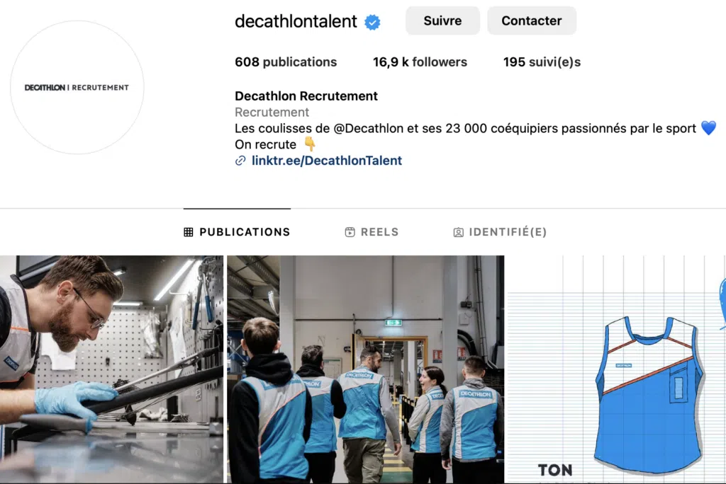 Reprenons Décathlon qui dédie un compte Instagram aux candidats et salariés (les talents), mais aussi des vidéos Youtube pour sensibiliser aux valeurs de la marque et à la passion commune pour le sport. Le contenu s’inscrit dans une stratégie de marketing RH et permet d’attirer et de fidéliser les collaborateurs (par exemple, en les incluant dans le processus de création).