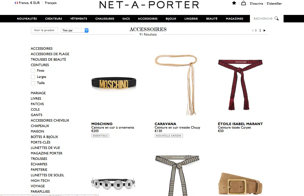 Si vos pages de recherche affichent les visuels de vos produits, inutiles d’utiliser des CTA « Voir le produit » car l’internaute sait de lui-même qu’il peut accéder à la fiche produit en cliquant sur l’image. Après tout, Google n’affiche pas un CTA « Voir le site » au-dessus de chacun de ses résultats. Une page de recherche, on le voit avec l’exemple ci-dessous (Net-a-porter) peut très bien ne contenir aucun CTA :