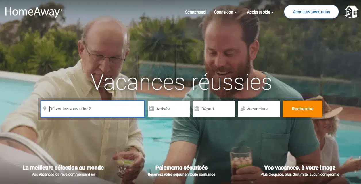 Dans la plupart des cas, en e-commerce, le bouton redirige vers une page de résultat qui permet à l’internaute de faire son choix parmi les produits que vous proposez. Soignez bien le wording du bouton. Il doit être aussi clair et direct que possible. Par exemple : « Acheter maintenant » ou « Rechercher ». Evitez les formules du type « En savoir plus ». Exemple (Homeaway) :
