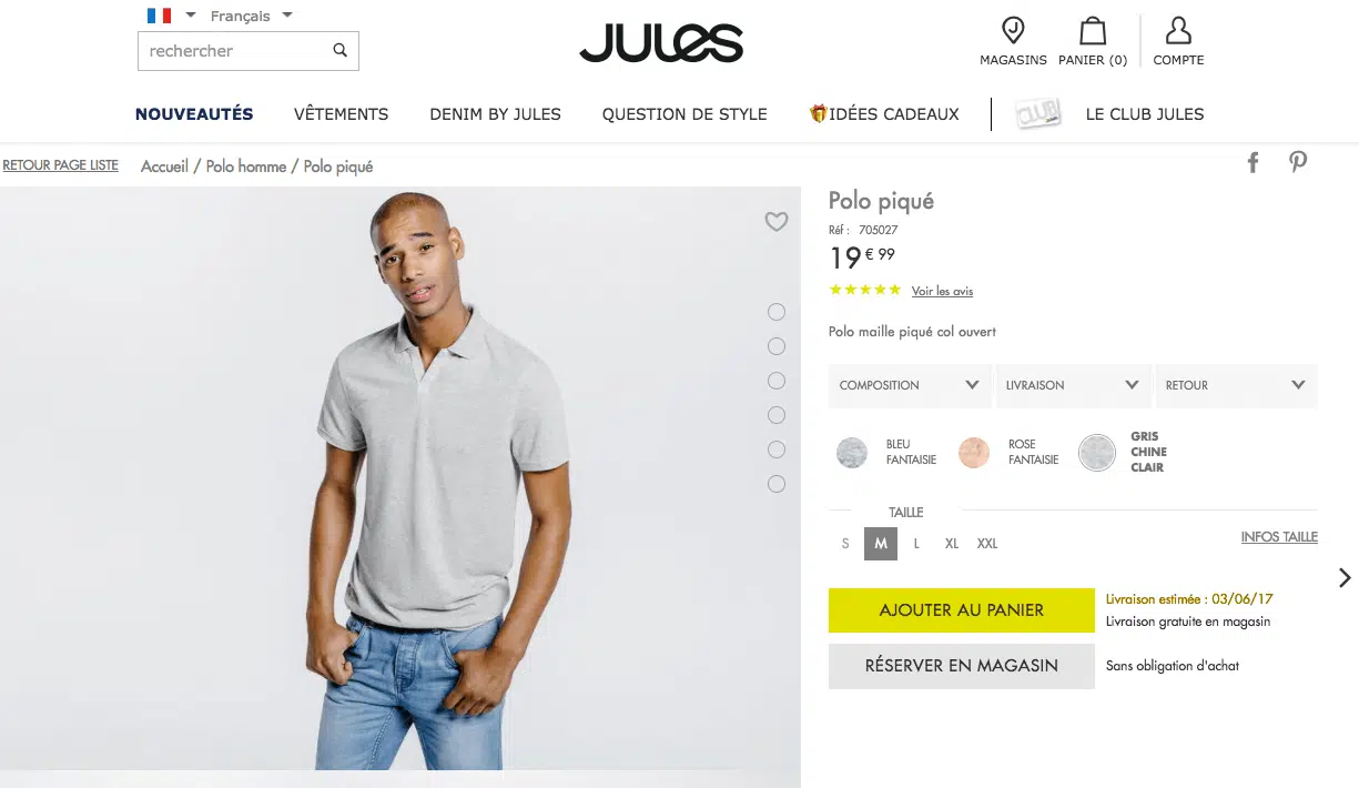 Le CTA principal, sur une page produit, concerne le dernier objectif : faciliter le processus de paiement. Sur quasiment tous les sites ecommerce, c’est le bouton « Ajouter au panier » qui remplit ce rôle. Exemple (Jules) :