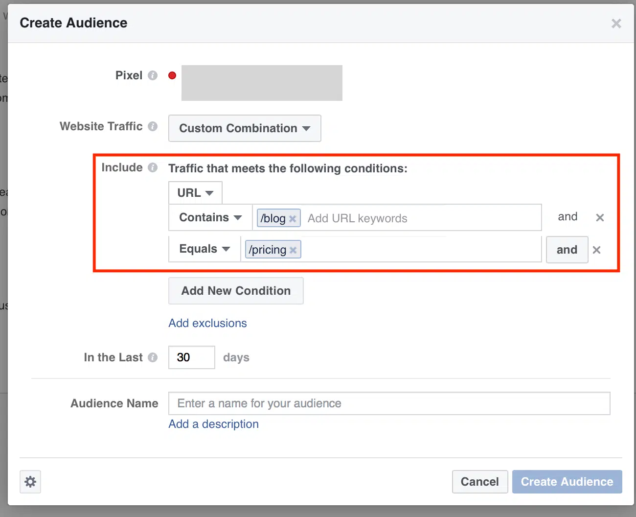 - Cibler les personnes qui ont lu au moins un article de votre blog + qui ont visité une landing page.