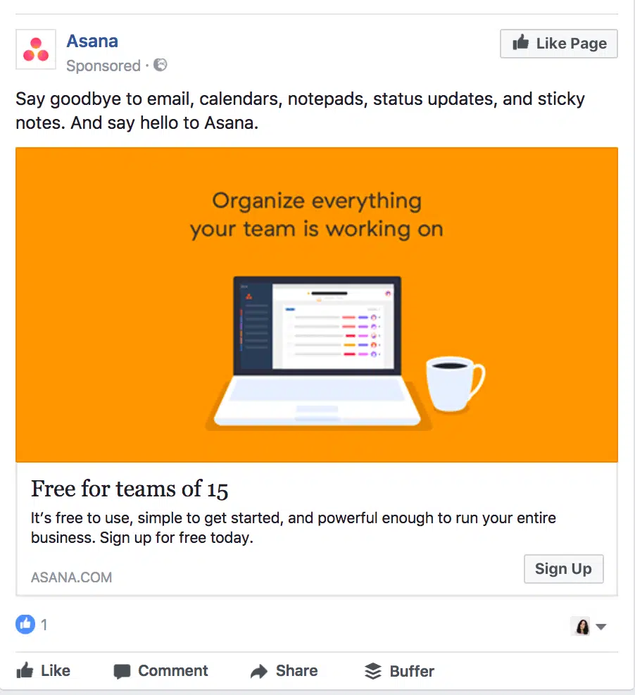 Lorsque vous retargetez les visiteurs de votre site web, soyez vigilant sur le design de la publicité. Elle doit être cohérente avec le design de votre site. Concrètement, si la page d’accueil de votre site web est rose vif, créez des annonces roses vifs. Cela permet à vos visiteurs de se rappeler plus facilement de vous. Dans l’exemple ci-dessous, Asana utilise le orange, qui est aussi la couleur de sa page d’accueil :