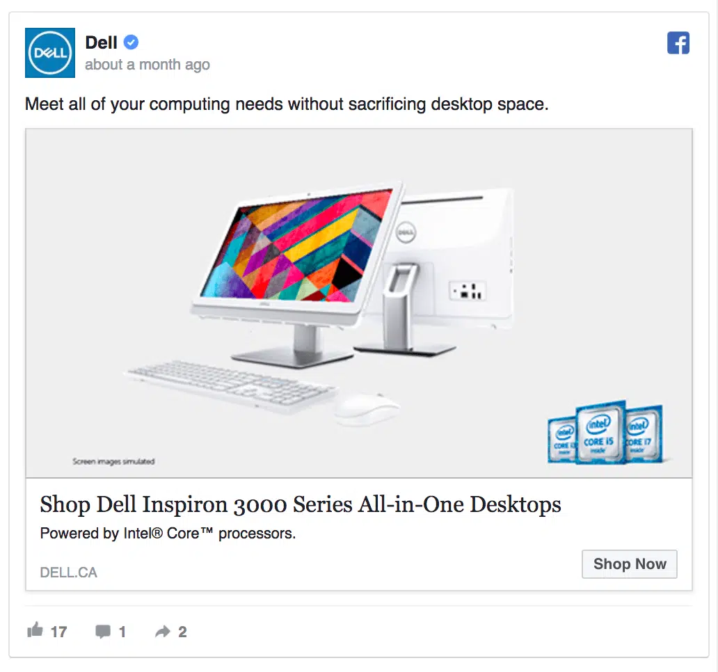 Dell, de son côté, recible ses clients B2B avec un post Facebook qui met en avant ses nouveaux produits :