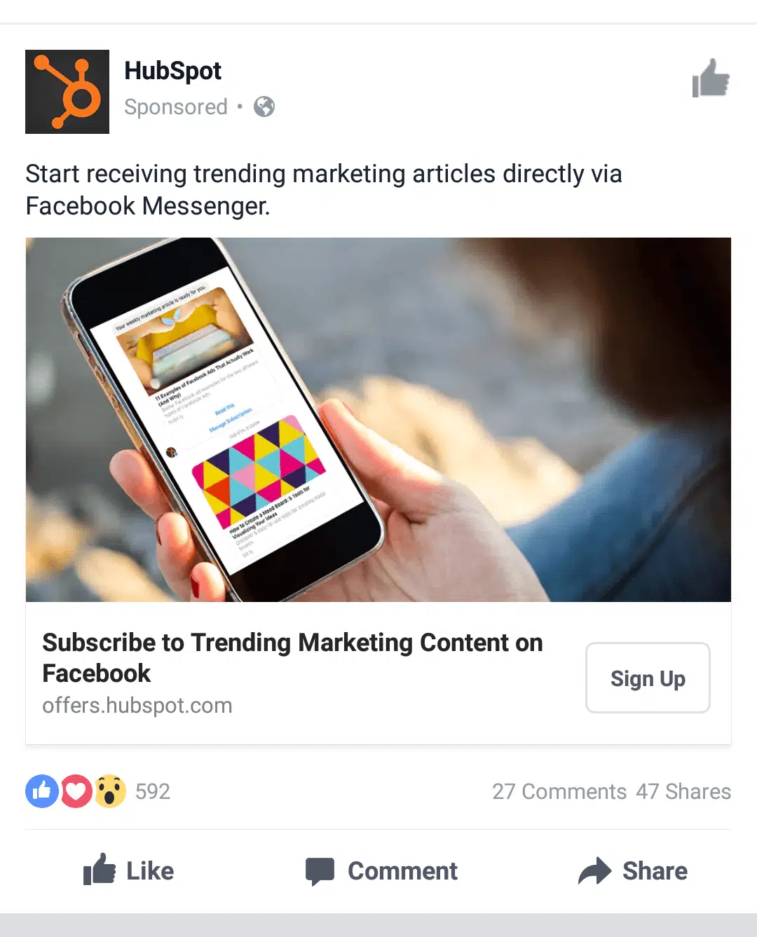 Notre conseil : créer des publicités qui font la promotion de vos meilleurs contenus, pour développer leur intérêt pour votre marque. De plus en plus d’entreprises incitent leurs lecteurs à s’inscrire pour recevoir les derniers articles du blog via des canaux de messagerie comme Messenger, WhatsApp ou via des notifications push, qui sont désormais largement utilisés pour l’automatisation marketing.