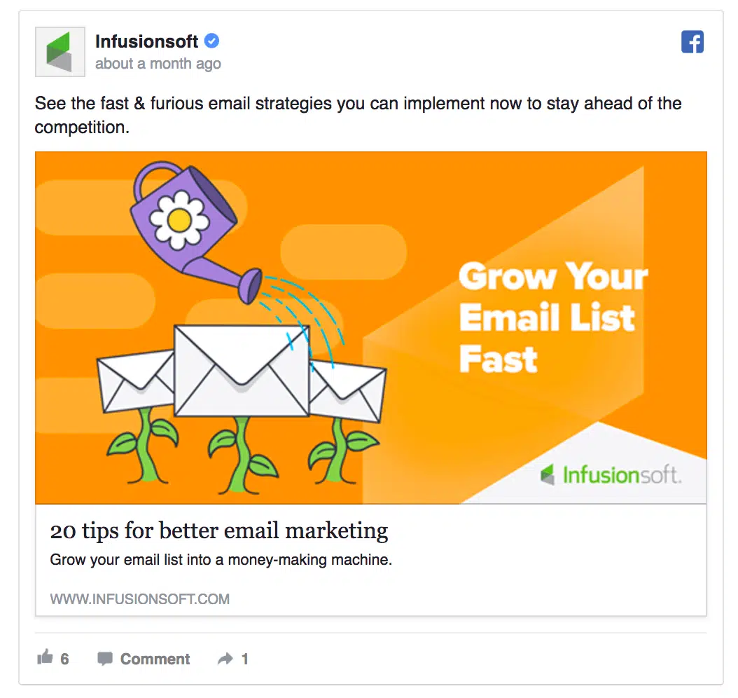 Une des manières pour ré-engager les visiteurs de vos landing pages consiste à leur partager des contenus pertinents, c’est-à-dire des articles de blog sur des sujets liés à la landing page visitée. Par exemple, Infusionsoft recible les visiteurs de sa landing page d’email marketing en proposant un guide sur l’email marketing :
