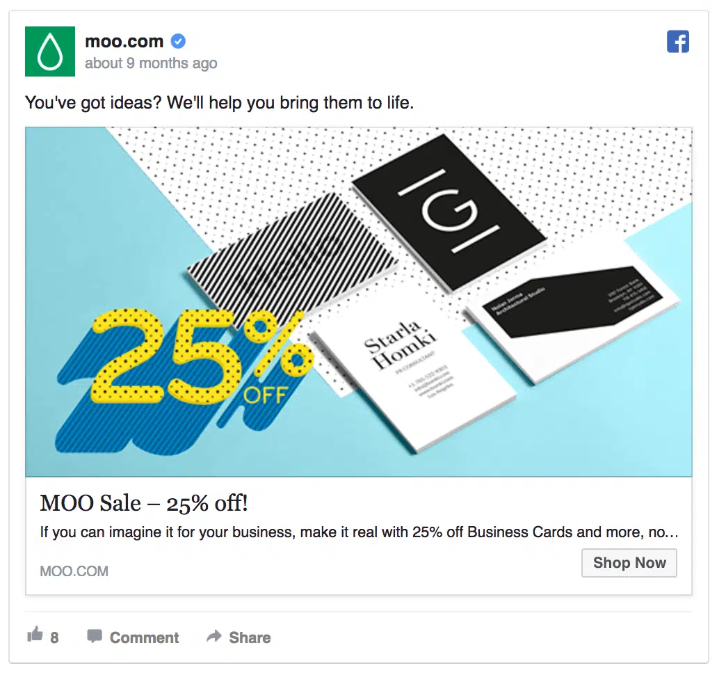 En effet, ils ont accepté de donné des informations personnelles (nom, prénom, email, entreprise, site web, fonction, etc.) pour recevoir l’eBook en échange. Vous pouvez les inciter à aller encore plus loin dans le tunnel en leur proposant des publicités orientées achat : par exemple, une promotion sur vos produits phares. Pour certains leads, vous pouvez même aller plus loin et proposer une promotion sur l’ensemble de vos produits. C’est ce que fait Moo dans cet exemple :