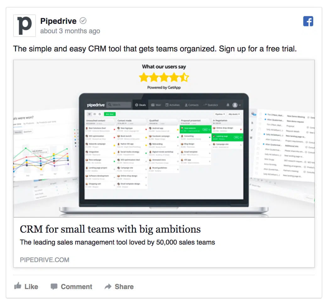 Si vous proposez un SaaS, vous pouvez cibler les personnes qui ont téléchargé votre eBook en leur offrant une période d’essai gratuite pour transformer vos leads qualifiés en clients. C’est ce que fait Pipedrive :