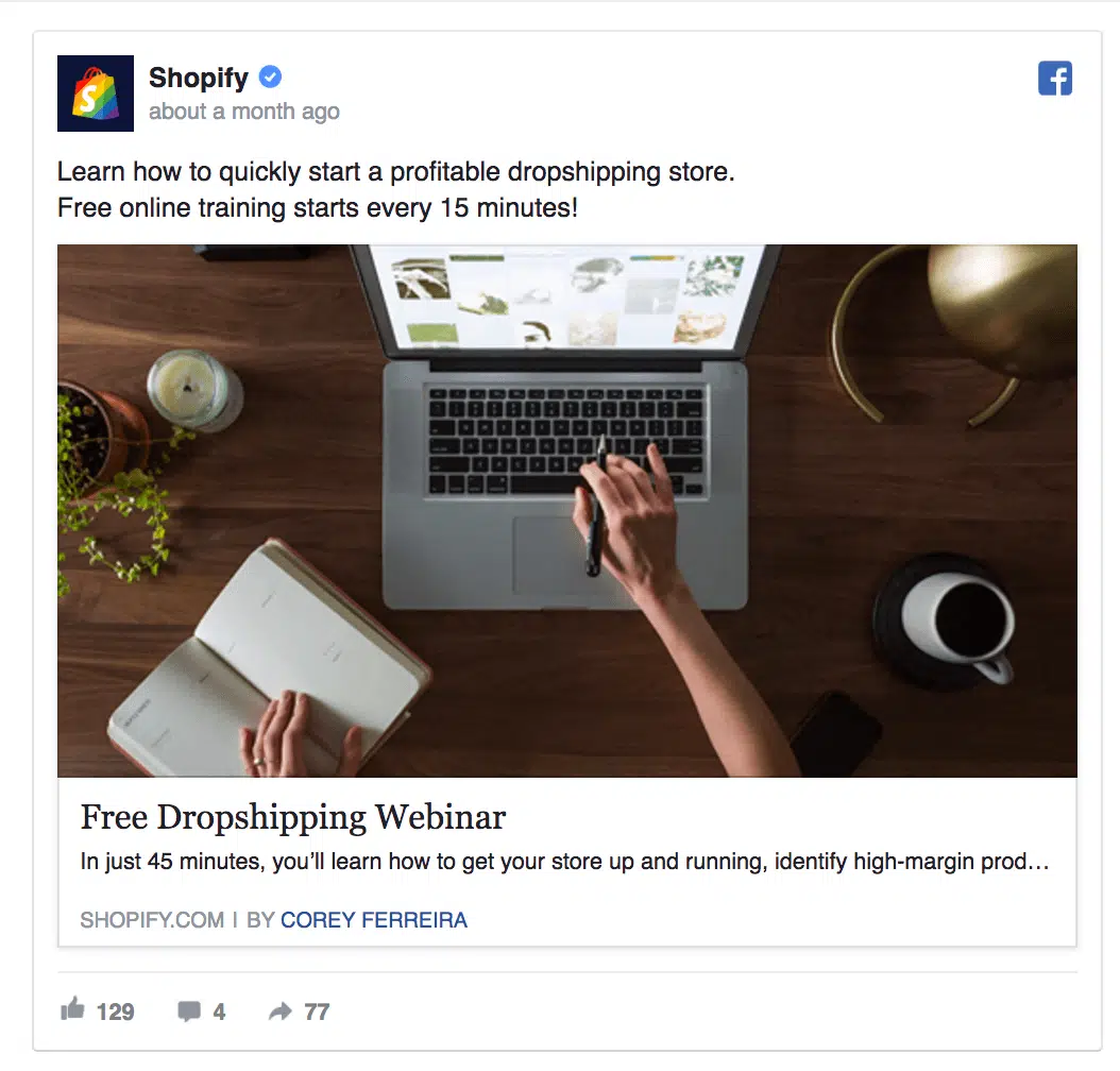 Dans l’exemple qui suit, Shopify a crée une publicité offrant 45 minutes de webinar. Il peut être très pertinent de recibler les utilisateurs encore mal à l’aise avec votre application (= ceux qui viennent de la télécharger par exemple) avec ce genre d’annonces sur Facebook.