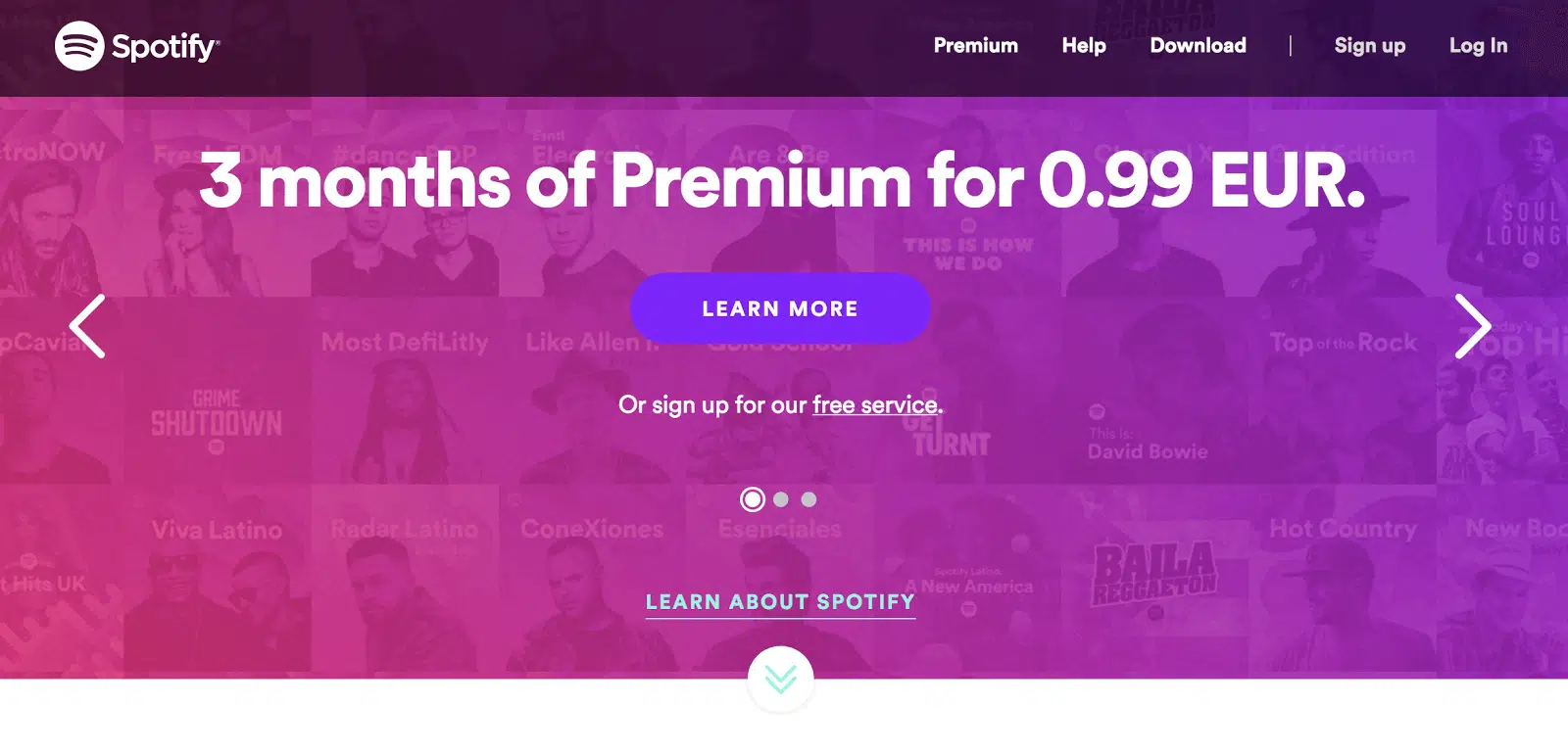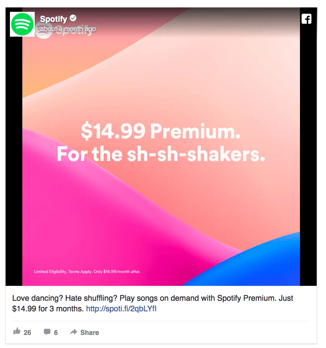 En reciblant les utilisateurs Freemium, l’objectif marketing est similaire à celui poursuivi à travers le reciblage des utilisateurs de la période d’essai : gagner des clients. Pour y parvenir, vous devez convaincre les utilisateurs Freemium que la version payante de votre produit ou de votre service apporte quelque chose de plus – et quelque chose de significatif. Les utilisateurs de la version Freemium sont déjà bien engagés dans le tunnel de conversion, ils sont donc en toute logique plus facile à convertir. A condition que vous vous y preniez bien. La meilleure méthode consiste à leur proposer de tester votre version payante. C’est ce que fait Spotify. Le service de streaming musical offre aux utilisateurs premium une remise de 90% sur les trois premiers mois.