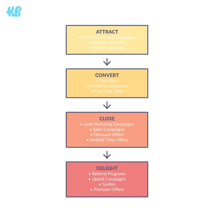 Dans le cadre de la mise en place de votre stratégie de retargeting sur Facebook, nous vous conseillons de créer des campagnes de publicité pour chacune des étapes de votre tunnel de conversion (voir schéma ci-dessus). Cela vous permettra d’affiner le ciblage de vos publicités en fonction de l’audience cible et de sa place dans le tunnel de conversion.