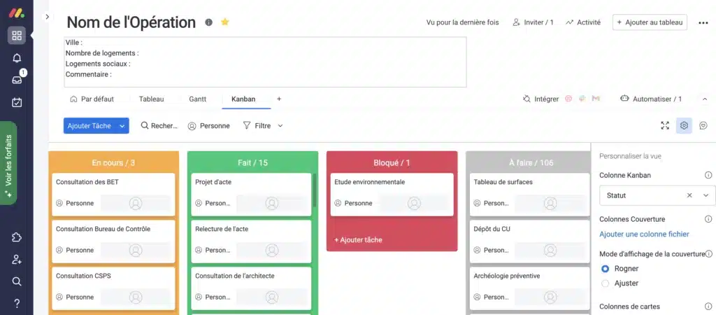 - Planning prévisionnel : L’établissement d’un planning prévisionnel détaillé est essentiel pour visualiser l’avancement de votre projet immobilier. Il permet de définir les tâches à réaliser, les délais associés, ainsi que les responsables de chaque étape. En mettant à jour régulièrement votre planning, vous pourrez identifier les retards éventuels, anticiper les problèmes et prendre les mesures nécessaires pour les résoudre. Utilisez des outils de gestion de projet intégrant des diagrammes de Gantt et des vues Kanban, désormais standards, pour représenter visuellement votre planning et suivre l’avancement des différentes étapes.