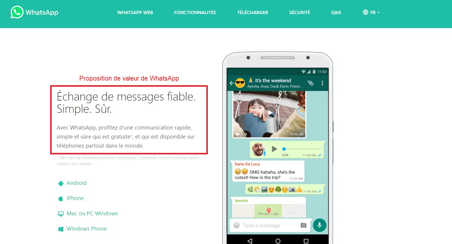 - De faire comprendre en 5 secondes à vos clients potentiels pourquoi ils doivent acheter ou tester votre produit. La proposition de valeur est une arme de communication massive. Elle peut être utilisée sur la homepage de son site web, comme dans l’exemple ci-dessous (WhatsApp).