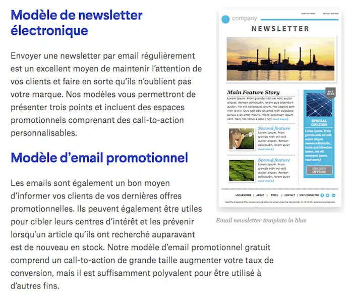 Pour finir, signalons les trois templates email gratuits disponibles sur le site de 99 Designs. Vous pouvez les télécharger sans avoir besoin de créer un compte au préalable. En fonction de votre besoin, 99 Designs propose : un modèle de newsletter, un modèle d’email promotionnel et un modèle d’email personnalisé.