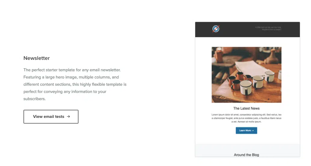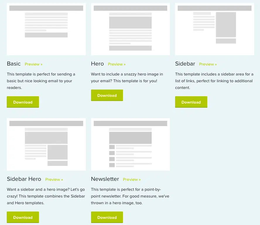 Litmus, le célèbre outil de tests de rendering email, propose sur son site 5 templates prêts à l’emploi, testés sur plus de 50 clients email : un template de newsletter, un template de mise à jour produit, un template d’email transactionnel…L’avantage de ces templates, c’est qu’ils sont supportés par pratiquement tous les clients de messagerie.