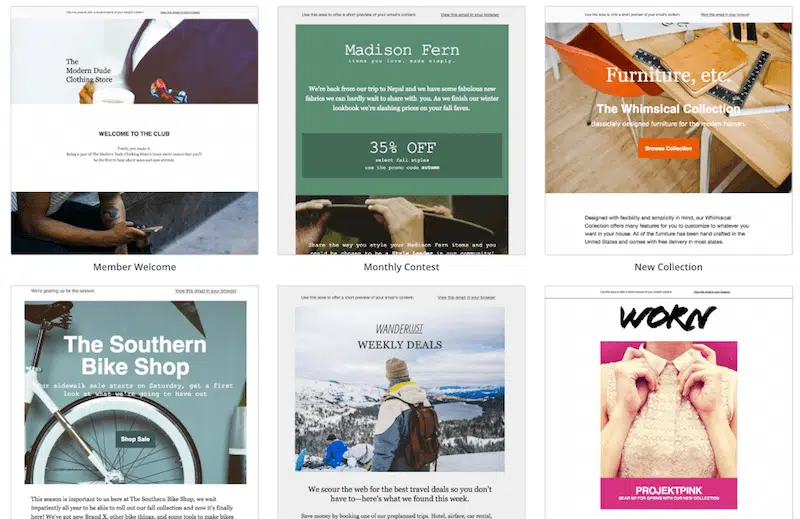 MailChimp propose, dans sa bibliothèque, plus de 130 templates emails responsive gratuits. Pour y accéder, il vous suffit de créer un compte gratuit. Les templates sont classés par catégorie : ecommerce, événements, vacances, newsletters, notifications. MailChimp propose également 20 templates HTML. Notez que l’exportation de templates HTML depuis Mailchimp vers d’autres solutions peut nécessiter des ajustements pour garantir une compatibilité optimale avec les outils d’emailing modernes.