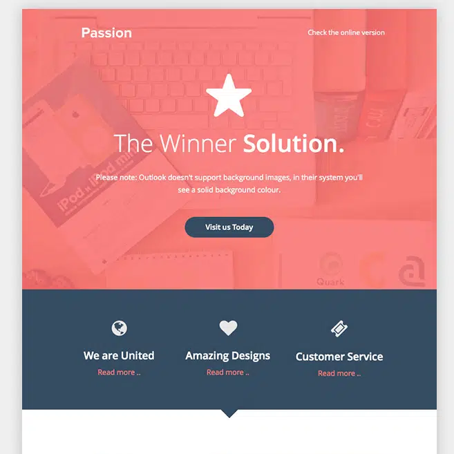 Email on Acid est un logiciel de testing d’emails bien connu. L’équipe d’Email on Acid a créé un template email responsive adaptable en fonction de vos besoins. Le template s’affiche en une, deux ou trois colonnes en fonction de la taille de l’écran de lecture. Ce que nous apprécions particulièrement dans ce template, c’est la variété des tailles d’écran supportée. Votre email s’affiche correctement, indépendamment de la taille de l’écran.