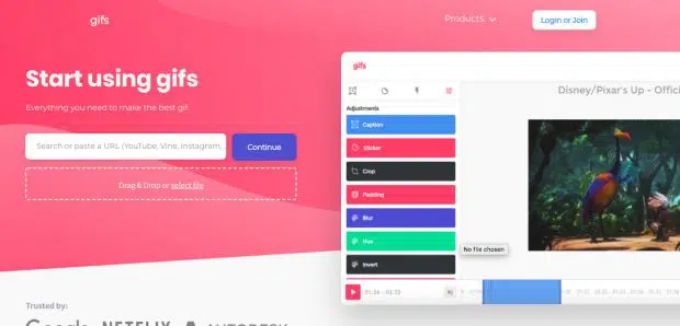 Comme il est dit sur la page d’accueil, vous pouvez faire un GIF à partir de centaines de sites vidéo. Vous pouvez également créer un GIF à partir d’images que vous téléchargez. Vous disposez également d’options d’édition d’image intégrées, bien que l’intégration avec Adobe Creative SDK ne soit plus d’actualité. Cela inclut donc le recadrage, le redimensionnement, les effets, les autocollants et même le dessin. Ce site a aussi une assez grande communauté. Idéal si vous cherchez à faire remarquer votre GIF ou à trouver de l’inspiration. Dans l’ensemble, c’est l’un des leaders.