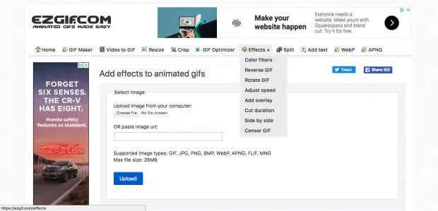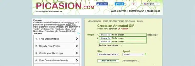 Énormément de pub sur cet outil. Vous pouvez importer des images à partir d’une URL ou de votre appareil. L’import direct depuis des plateformes comme Flickr ou Picasa n’est plus courant. Il y a de bien meilleurs fabricants de GIF dans cette liste, ne vous attardez pas sur celui-ci.