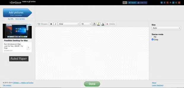 A première vue, vous pourrez croire que vous aurez beaucoup de fonctionnalités avec la mise en page, mais en réalité c’est très limité. Vous pouvez télécharger des images à partir d’une URL, de votre webcam et de l’ordinateur. Mais si vous utilisez l’URL, assurez-vous d’obtenir l’URL de l’image réelle, pas de la page. Vous pouvez ajouter des bulles et des formes à vos GIF, mais vous ne pouvez pas ajouter de texte sauf dans l’une de ces bulles. La fonctionnalité de recadrage et de redimensionnement fonctionne, mais elle est limitée en options. Vous devez sélectionner la taille de l’image, puis la recadrer automatiquement à partir du centre.