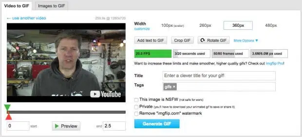C’est est un créateur d’image assez puissant avec beaucoup de fonctionnalités d’édition. Ce n’est pas non plus limité aux GIF. Vous pouvez également créer des memes, des affiches amusantes etc. C’est un outil très utile si vous souhaitez apporter une touche humoristique à vos publications. Lorsque vous l’utiliserez pour créer des GIF, il acceptera la plupart des formats de fichiers, y compris des liens Youtube ou des vidéo téléchargés. Cependant, la limite de téléchargement d’une vidéo Youtube est de 100 MO, ce qui est quelque peu pénalisant. En revanche, si vous souscrivez à un compte payant, vous pourrez télécharger des fichiers plus volumineux et supprimer le filigrane.