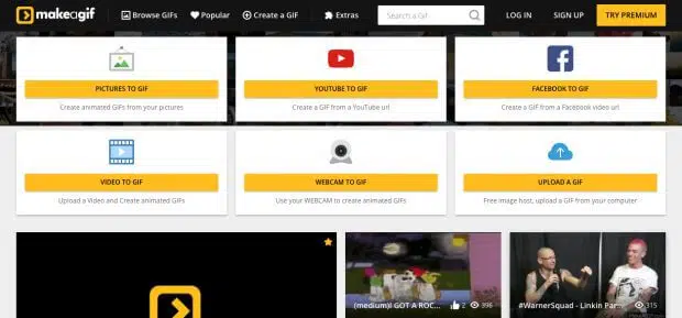 Cet un outil très facile à utiliser mais il est légèrement limité dans les fonctionnalités de personnalisation. Par exemple, le recadrage et le redimensionnement est un peu simpliste, et il n’y a aucun moyen d’ajouter du texte. Il dispose d’une fonctionnalité « Stickers », qui vous permet d’ajouter des autocollants à vos GIFs. Pour créer un GIF à partir de diverses sources, Make A Gif est très fiable. Vous pouvez même ajouter des images de Facebook. Il possède également une bibliothèque bien remplie.