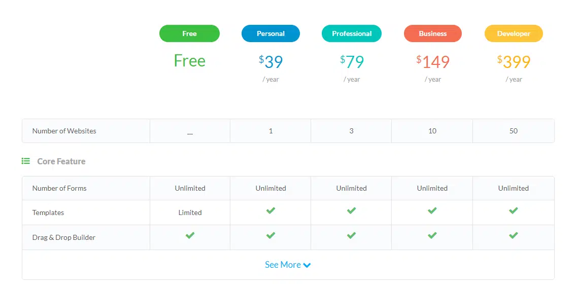 Grâce à WeForms créer des formulaires sera un jeu d’enfant. La conception par glisser-déposer intuitif accompagné de plus de 30 types de champs vous permettra de créer le formulaire de vos rêves. Et comme tous les développeurs de plug-ins veulent vous simplifier la vie, il est fourni avec une gamme de modèles à choisir. Après avoir créé votre formulaire, vous pouvez l’insérer n’importe où sur votre blog en utilisant le shortcode fourni. Les autres caractéristiques qui rendent WeForms unique sont que vous pouvez utiliser la logique conditionnelle dans vos formulaires, ce qui signifie que vous pouvez faire une tonne de choses intéressantes en fonction des actions de l’utilisateur. WeForm propose une version gratuite avec des fonctionnalités limitées et des forfaits allant de 39 $ à 399 $ par an.