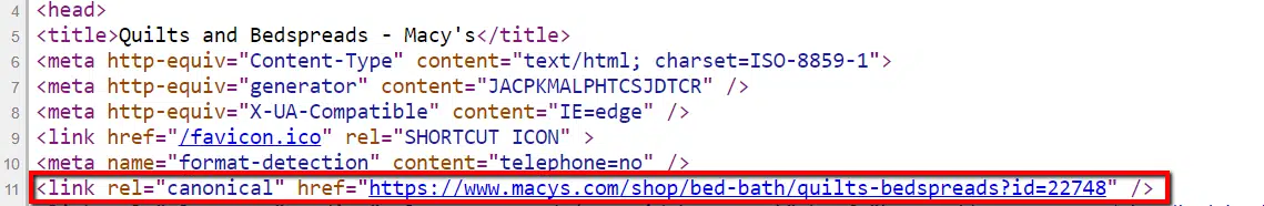 Comme vous le voyez, pour chacune de ces URL, une URL canonique est spécifiée, qui est la version la plus propre de toutes les URL du groupe : https://www.macys.com/shop/bed-bath/quilts-bedspreads?id=22748. Cela permet de réduire la valeur SEO de chacune de ces trois URL à une seule URL à afficher dans les résultats de la recherche (l’URL canonique).