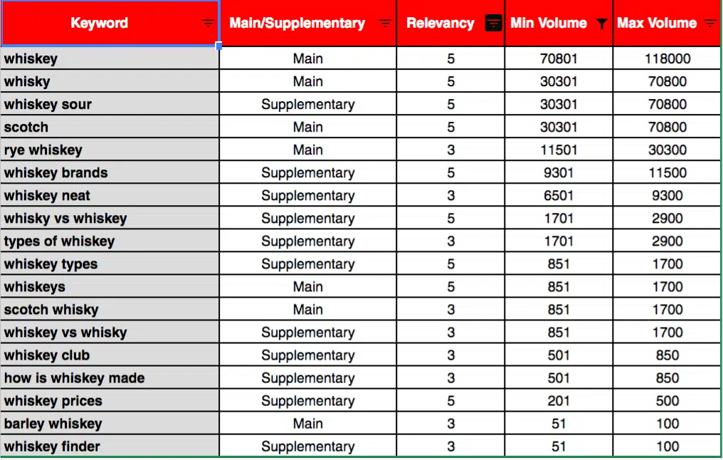 Dans les lignes directrices de Google relatives à la qualité de la recherche (document incontournable pour tous les référenceurs!), Il existe des références claires au contenu principal et au contenu supplémentaire. Le contenu principal sera votre page principale dans chaque section, qui définira vraiment la nature de votre catégorie. Il définira votre site comme une source pertinente pour un sujet. Le contenu supplémentaire fournit, comme son nom l’indique, des informations supplémentaires qui aident les utilisateurs à naviguer à l’intérieur du sujet et à prendre des décisions éclairées. La structure de l’URL est un élément essentiel pour bien faire les choses. Revenons donc à notre exemple de whisky pour voir comment nous pourrions y remédier. Notre site est axé sur le commerce électronique et nous voulons vendre le produit. Cependant, aller de l’avant et ne faire que repousser les pages de produits équivaut à une vision de tunnel SEO. Notre recherche initiale à l’aide d’outils d’analyse de mots-clés reconnus reste une excellente ressource pour élaborer ces plans. Aujourd’hui, de nombreux professionnels privilégient des plateformes qui intègrent l’IA ou des fonctionnalités avancées de regroupement thématique pour faciliter l’identification des sujets principaux. À partir de là, nous pouvons commencer à décider ce qui pourrait être considéré comme un sujet pour un contenu principal ou une page de contenu supplémentaire.
