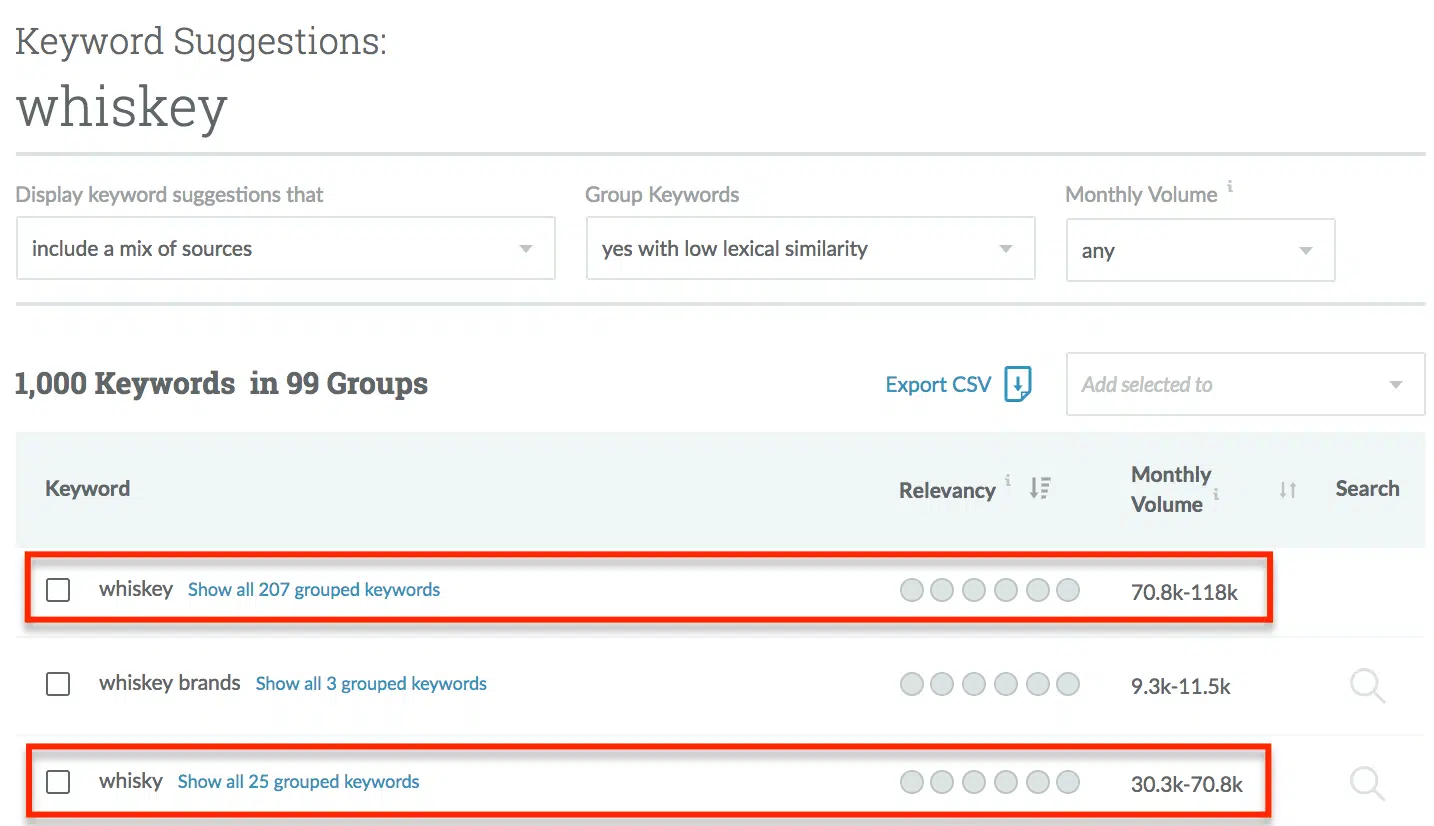Le volume de recherche est plus important avec «whiskey» donc, continuons avec cette orthographe.