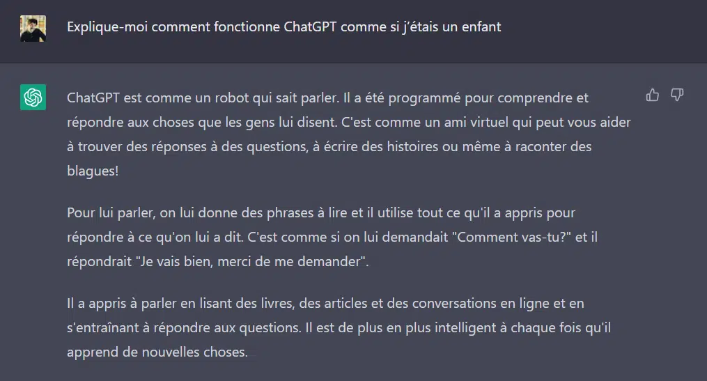 Mais alors, comment ça marche ChatGPT ? Difficile d’expliquer son fonctionnement sans entrer dans le détail. Plutôt que de vous parler d’API ou de clé d’accès, laissons l’outil répondre lui-même à la question suivante : « Explique comment fonctionne ChatGPT comme si j’étais un enfant ».