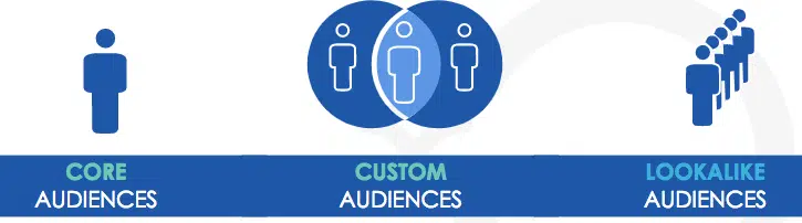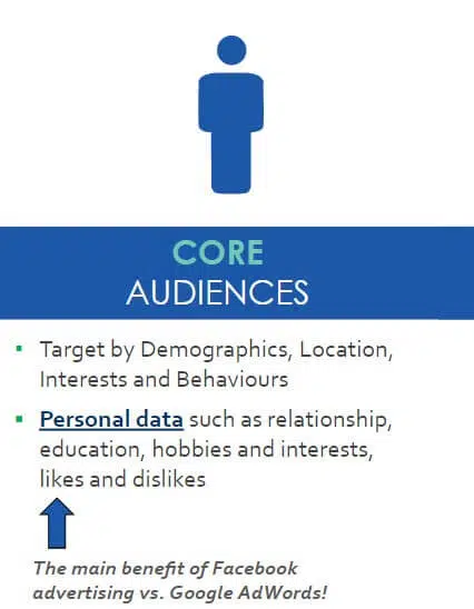 - Les « core audiences » sont les options de ciblage de base de Facebook pour les annonceurs. Les options disponibles sont le ciblage démographique, géographique, d’intérêt et comportemental.