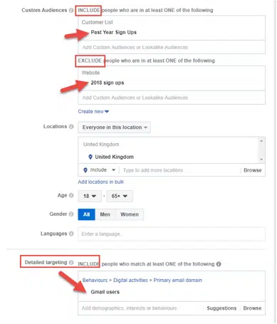 Une fois que vous disposez de ces données, configurez une nouvelle campagne contenant ces mots-clés TOFU et appliquez la liste d’audience Facebook (transférée via UTM et segmentée dans Google Analytics) comme cible. Cela a pour but que seule les nouveaux utilisateurs qui ont cliqué sur vos annonces seront éligibles pour voir cette campagne.
