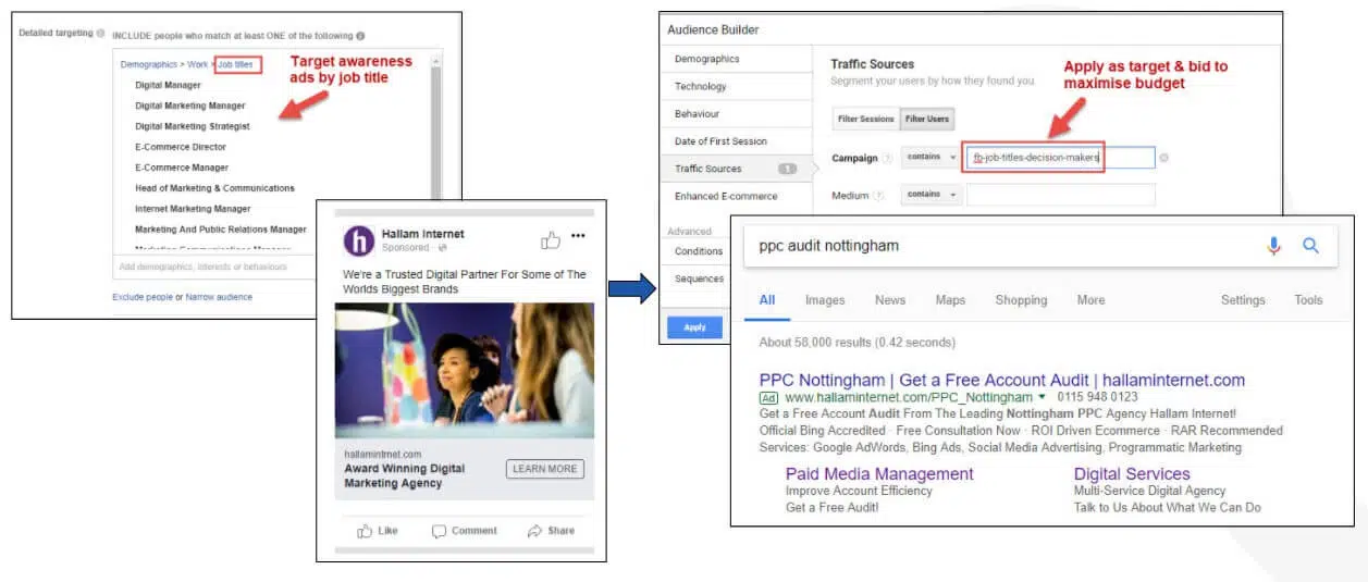 - Appliquez cette liste d’audience en tant que cible et enchère à vos campagnes de recherche Google AdWords pour vous assurer que seuls les décideurs ayant été atteints par votre annonce sur Facebook voient l’annonce sur Google.