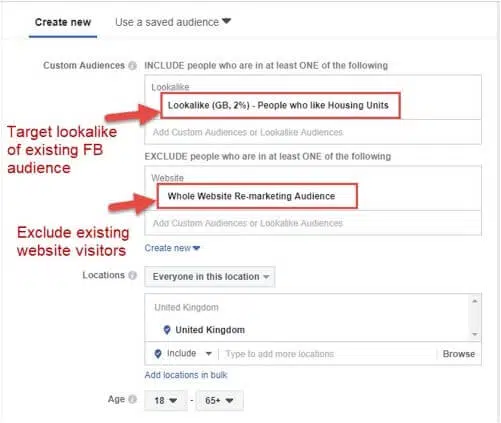 Pour ce faire, vous devez d’abord créer une nouvelle campagne ciblant un « lookalike » de l’un de vos publics existants. Dans l’exemple ci-dessous, nous avons utilisé un lookalike de page existantes, mais vous pouvez également créer des lookalike à partir des listes de clients et des données d’audience de sites web.
