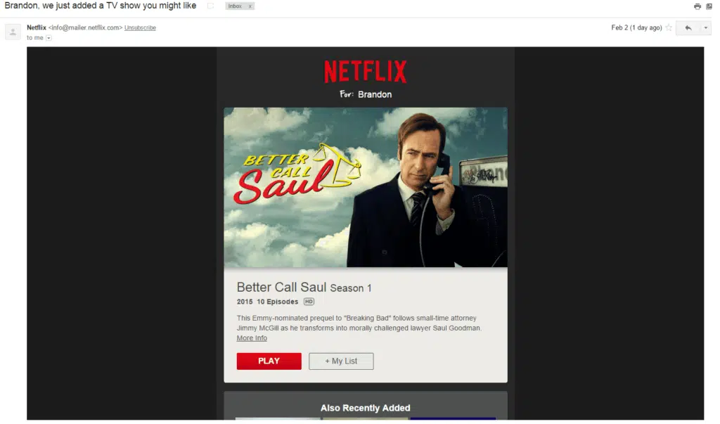 Les utilisateurs de Netflix peuvent attribuer un classement au contenu en indiquant leur goût / aversion. Ceci, associé au nombre de flux et au profil d’utilisateur individuel, permet à l’algorithme de prédire le contenu qui serait préféré par les utilisateurs. En combinant avec succès les attributs comportementaux à l’apprentissage prédictif, Netflix envoie des recommandations à leurs utilisateurs sur le contenu.