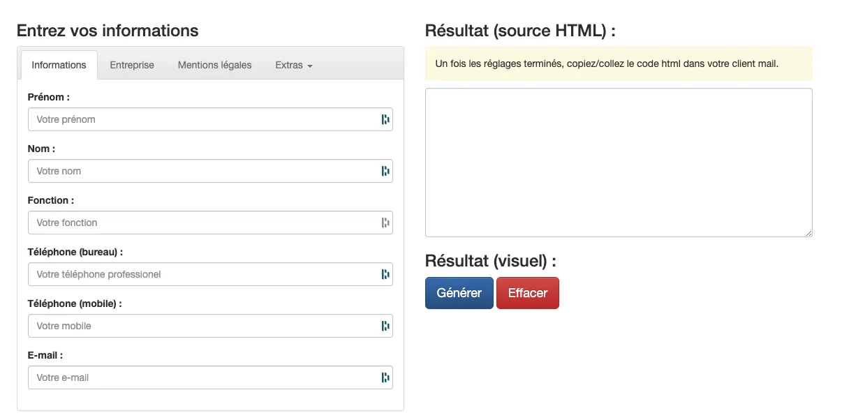 - Générateur de signature HTML : Permet de créer facilement une signature personnalisée à intégrer dans les emails professionnels ou personnels.