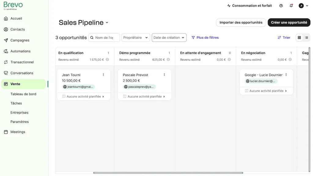 Le logiciel Brevo propose une option de CRM intégrée permettant de rassembler toutes les informations concernant les leads et les contacts au même endroit.