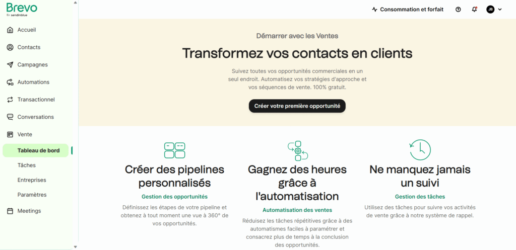 Le logiciel Brevo propose une option de CRM intégrée permettant de rassembler toutes les informations concernant les leads et les contacts au même endroit.