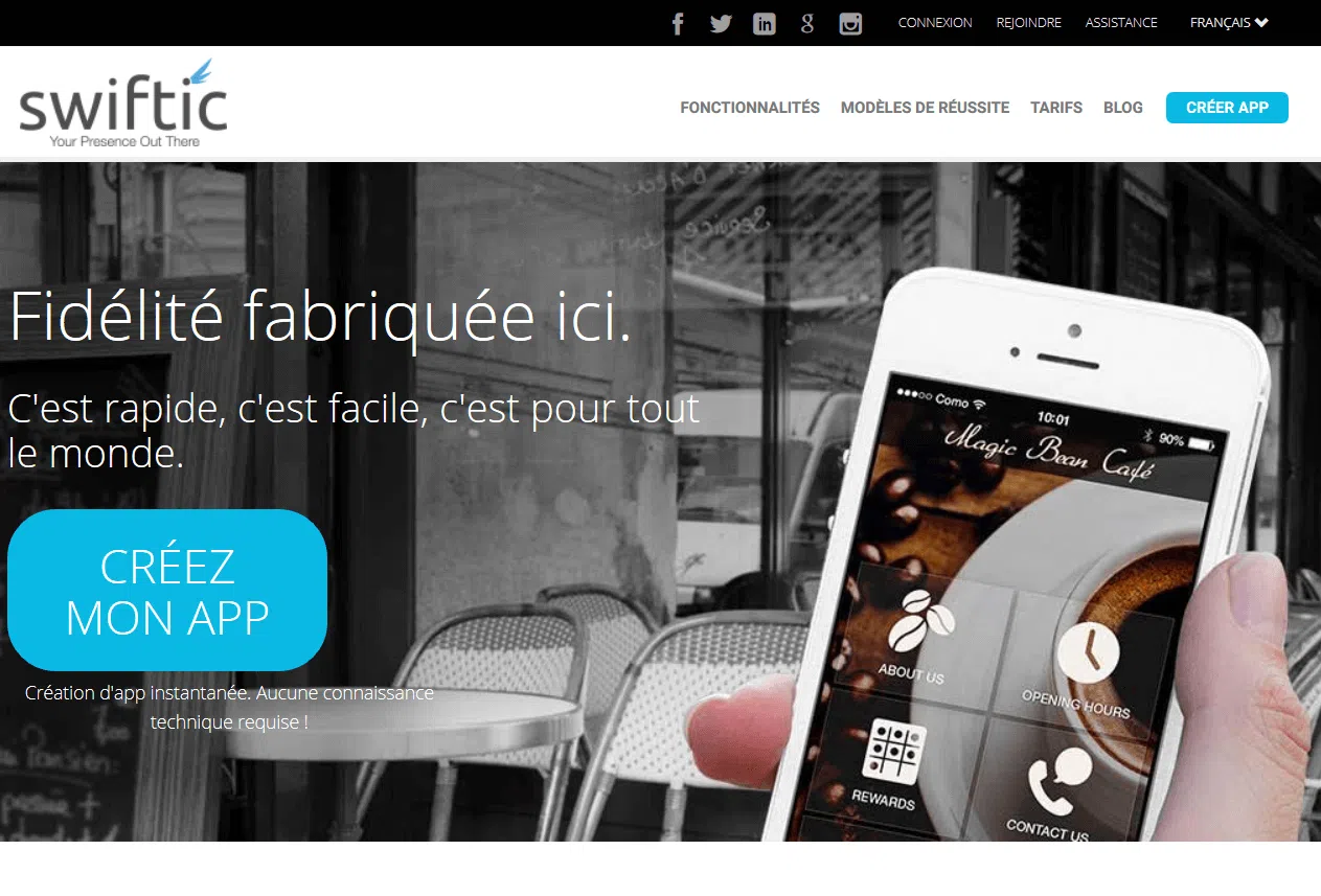 Swiftic permet de créer des applications personnalisées selon vos besoins en seulement 3 étapes, directement sur leur site. De plus, l’outil de création intégré au site de Swiftic permet de visualiser en direct le rendu de votre application sur mobile, grâce à un aperçu situé sur la droite sur la page de création de l’application.