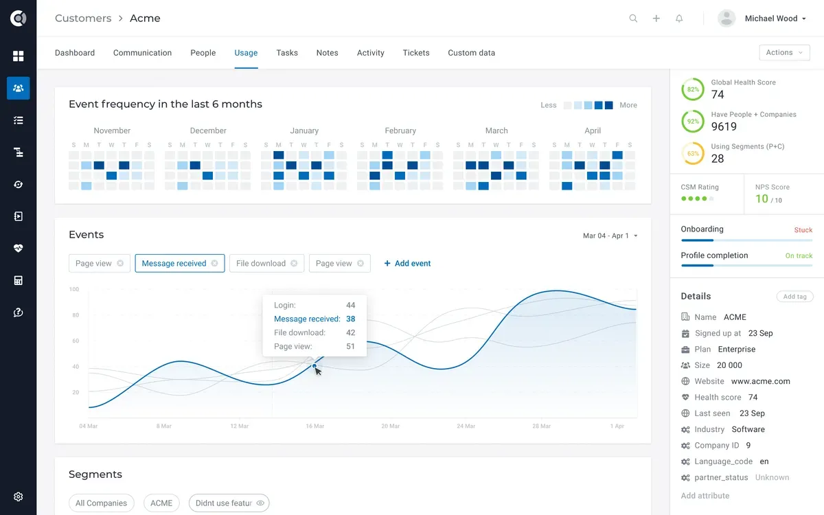- Vue 360° sur chaque client (adoption, usage, interactions).