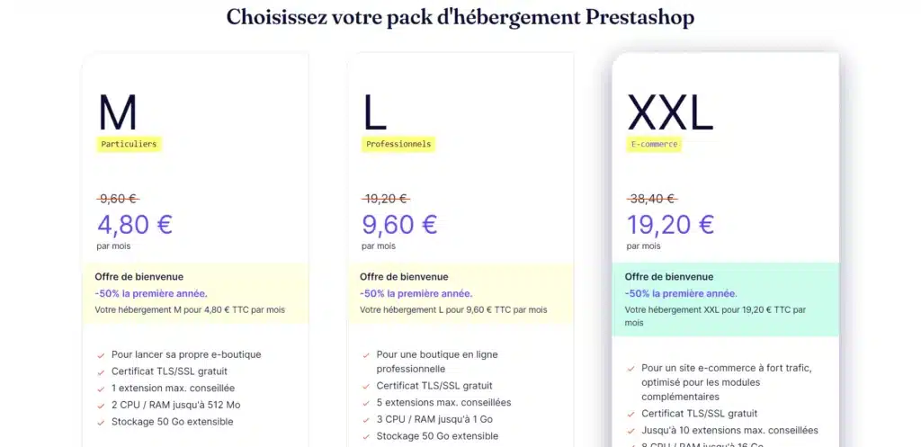 Pour profiter de l’hébergement de votre boutique en ligne et de l’installation rapide de la solution Prestashop, vous avez le choix entre 3 offres :