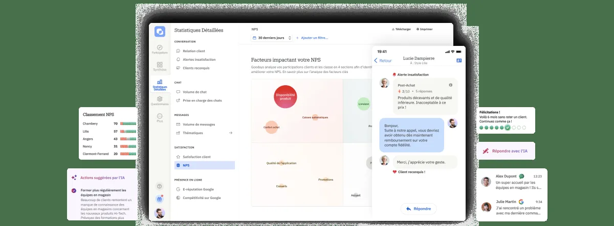 Les équipes peuvent répondre aux avis clients, engager la conversation et traiter les insatisfactions en temps réel grâce à des alertes automatiques. 70% des clients à risque se déclarent reconquis après une réponse via la plateforme. Les indicateurs fournis encouragent la culture de l’action et permettent d’identifier rapidement les axes d’amélioration.