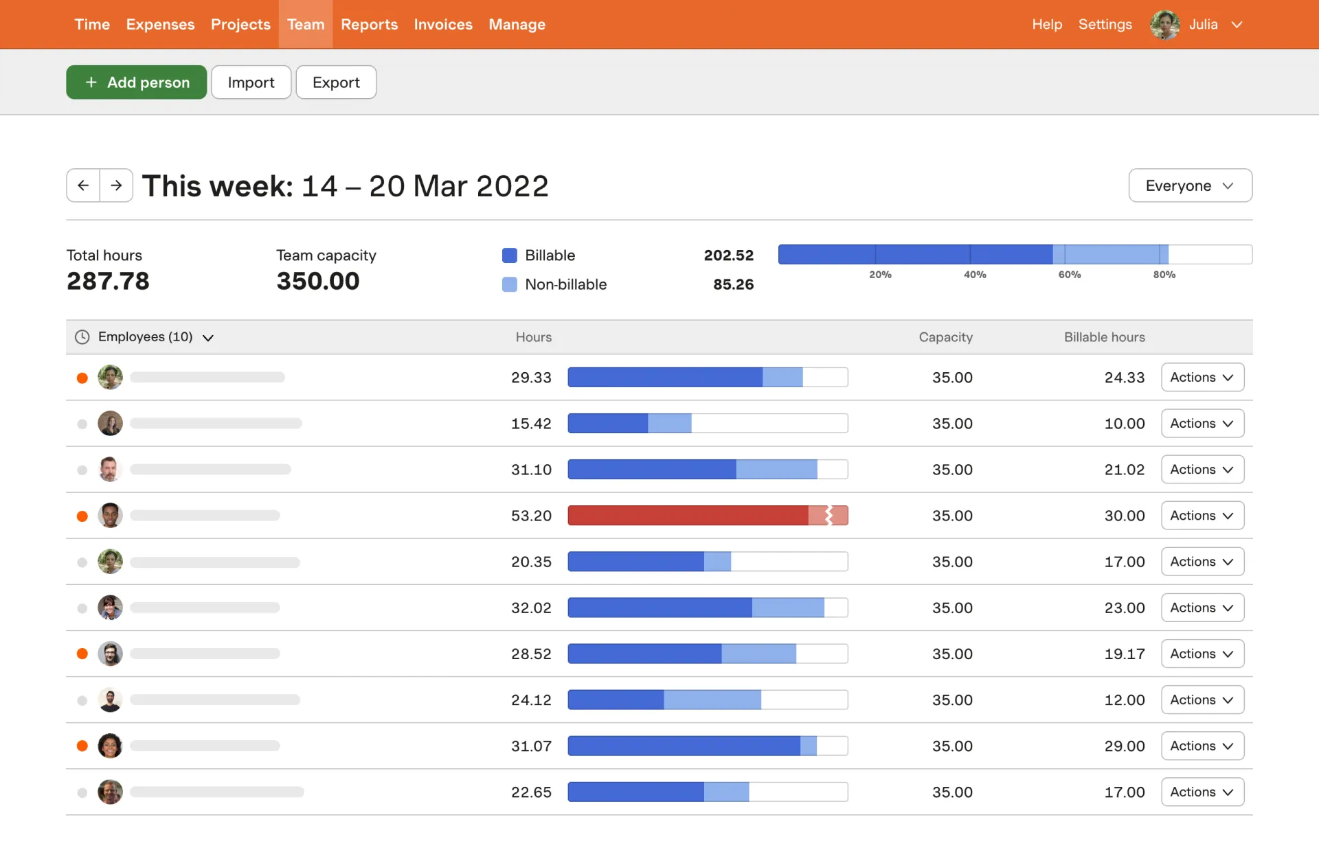 - Suivi de la charge de travail et de la répartition du temps par projet et par tâche pour une meilleure gestion d’équipe.