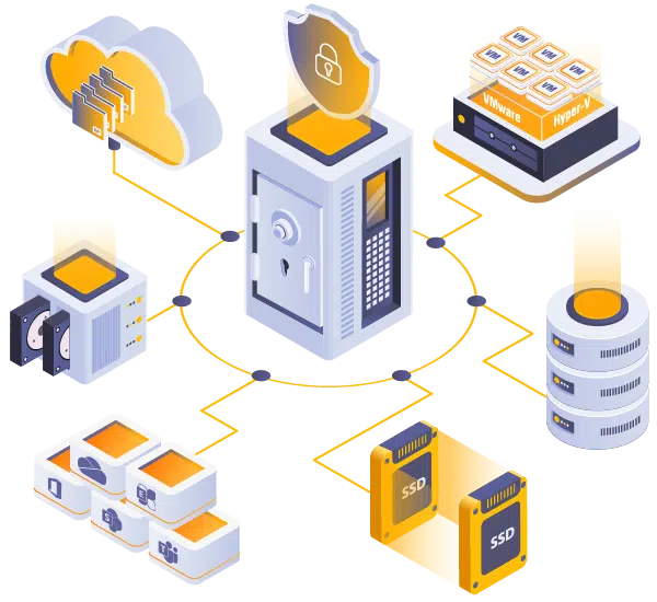 - Adapté à la sauvegarde et la restauration de systèmes, environnements virtuels, bases de données et services Cloud.