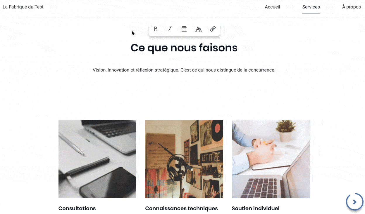 Les photos intégrés sur votre site correspondent à celles qui sont associées à l’adresse Google Maps que vous avez validé ou renseigné dans le questionnaire. Sur l’interface d’édition, le chatbot vous propose d’éditer le texte et d’ajouter des images pour personnaliser votre site. L’assistant vous aide dans cette tâche, allant jusqu’à vous proposer des exemples de ce que les autres font :
