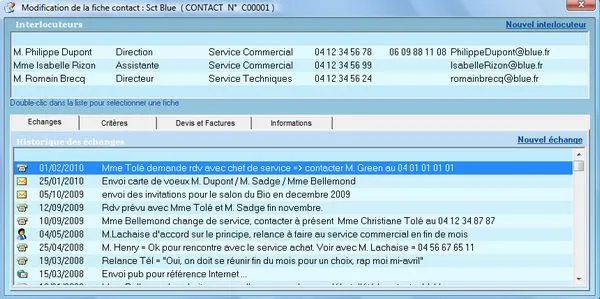 La solution offre une gestion personnalisée des contacts, qu’il s’agisse de clients, prospects, fournisseurs ou relations diverses. Chaque fiche contact permet de centraliser les informations et la documentation associée, ainsi que l’historique des échanges commerciaux (téléphone, email, courrier, rencontres, etc.).