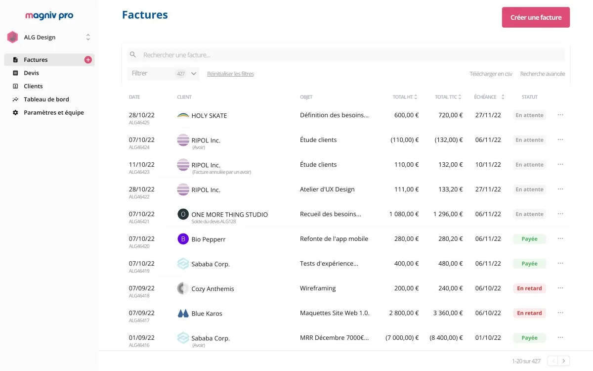 Simplifiez votre gestion financière avec Magniv Pro : une solution de facturation conçue pour toutes entreprises, garantissant simplicité, adaptabilité et sécurité. Expérimentez une facturation sans tracas grâce à ses fonctionnalités avancées et un support client toujours à l’écoute. Cliquez pour transformer la facturation en atout stratégique.