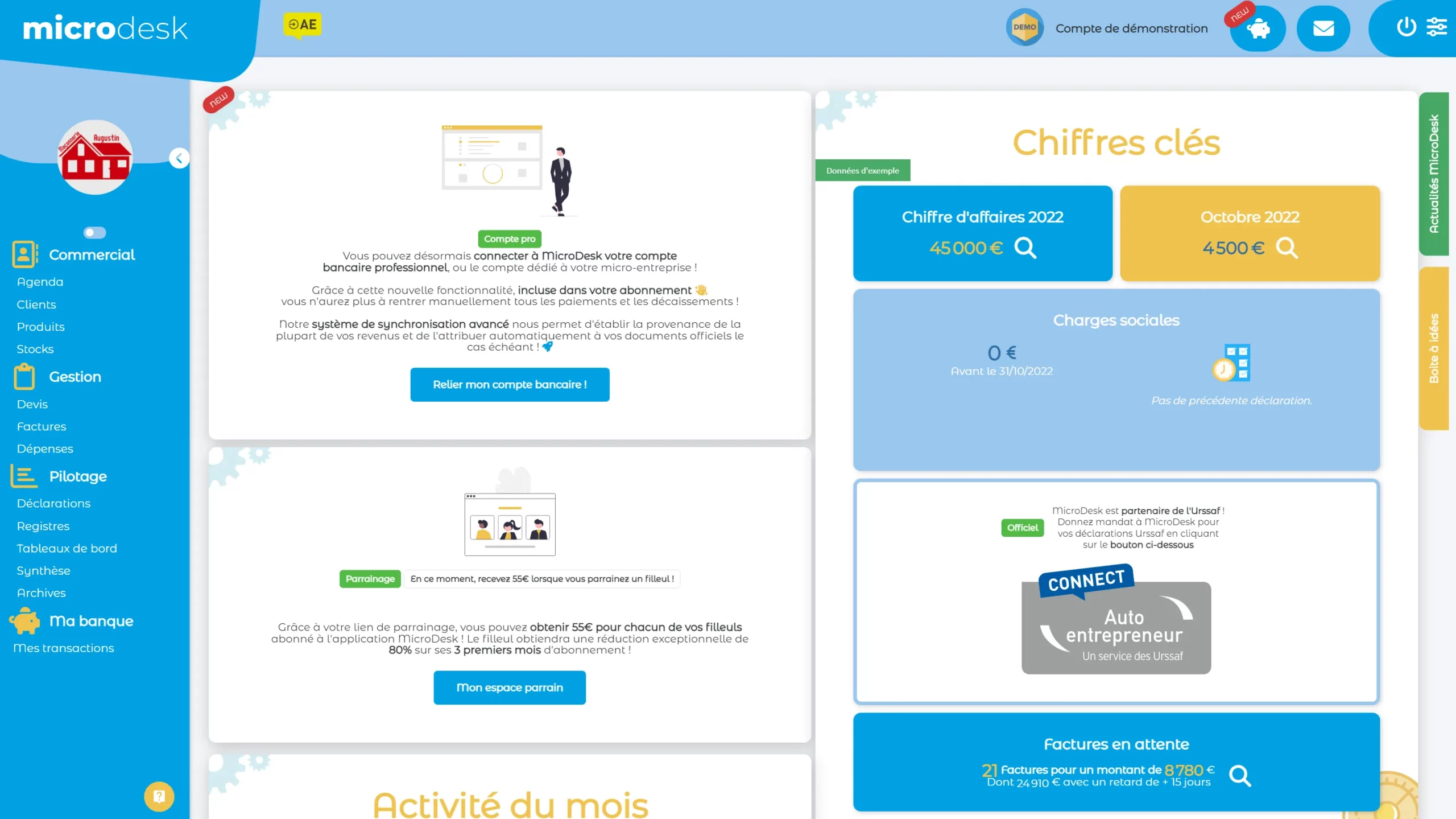 Ce logiciel propose une solution complète et intuitive pour la gestion administrative des micro-entrepreneurs. Il centralise l’ensemble des tâches essentielles : création de devis et factures, suivi des paiements, gestion des déclarations sociales, synchronisation bancaire, gestion des stocks, fournisseurs, agenda et webmail. L’objectif est de permettre aux utilisateurs de gagner du temps, de respecter leurs obligations légales et de piloter leur activité en toute sérénité.